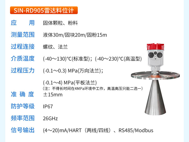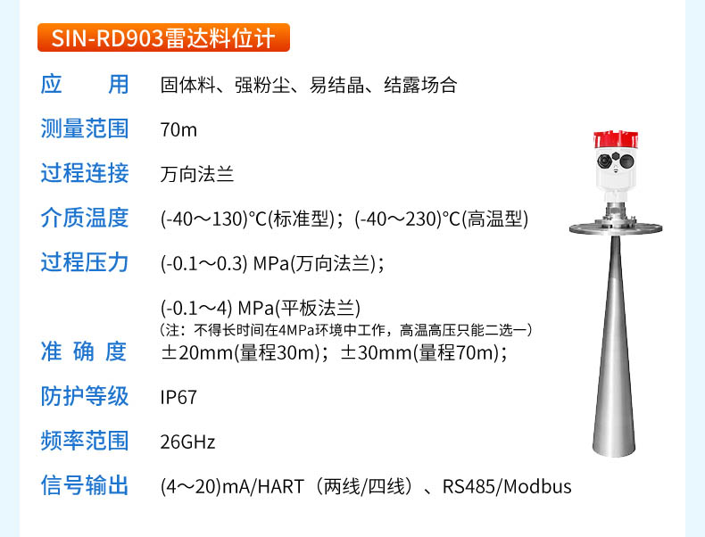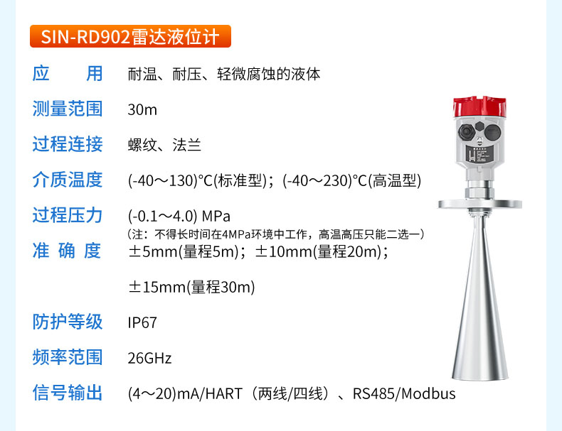 90系列傳感器是26G高頻雷達(dá)式物位測(cè)量?jī)x表,測(cè)量最大距離可達(dá)80米。聯(lián)測(cè)儀表SIN-RD906雷達(dá)液位計(jì)天線被進(jìn)一步優(yōu)化處理,新型快速的微處理器可以進(jìn)行更高速率的信號(hào)分析處理,使得儀表可以用于各種強(qiáng)腐蝕性液體的測(cè)量。