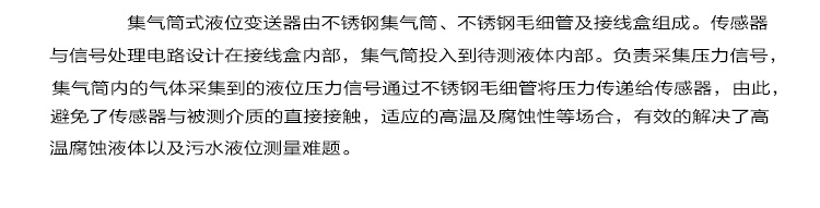 聯測儀表SIN-P260G殼體高溫型集氣筒式液位計用于測量較高溫度液體介質的液位,原理是被測液體介質壓縮集氣桶內的空氣,空氣壓力通過毛細管傳遞給敏感元件,敏感元件本身不與被測介質直接接觸,因此變送器可以應用在較高溫度的介質環境中,同時,內置微型信號放大處理電路,可以直接與計算機接口卡、控制儀表、智能儀表或 PLC 等連接,進行遠程傳輸。液位變送器廣泛應用于環保、水利、供水、工業過程控制、變頻供水等較高溫度介質的液位測量。