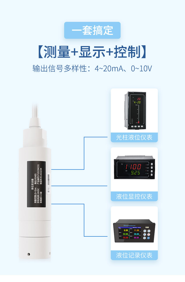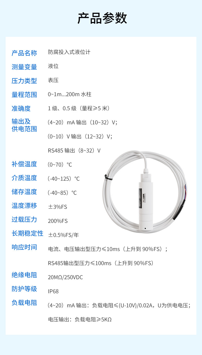 聯(lián)測(cè)儀表SIN-P262/P262-B陶瓷芯體防腐投入式液位計(jì)由高性能陶瓷壓力傳感器作為測(cè)量元件,把與液位深度成正比的液體靜壓力準(zhǔn)確的測(cè)量出來(lái),并經(jīng)過(guò)信號(hào)調(diào)理電路轉(zhuǎn)換成標(biāo)準(zhǔn)的電流、電壓或RS485 信號(hào)輸出,建立起輸出信號(hào)與液位深度的線性對(duì)應(yīng)關(guān)系,實(shí)現(xiàn)對(duì)液體深度的測(cè)量。產(chǎn)品采用聚四氟乙烯防腐材質(zhì),具有優(yōu)良的耐腐蝕性能,廣泛適用于化工廠酸、堿性等腐蝕介質(zhì)的液位測(cè)量。