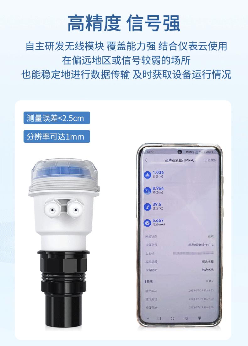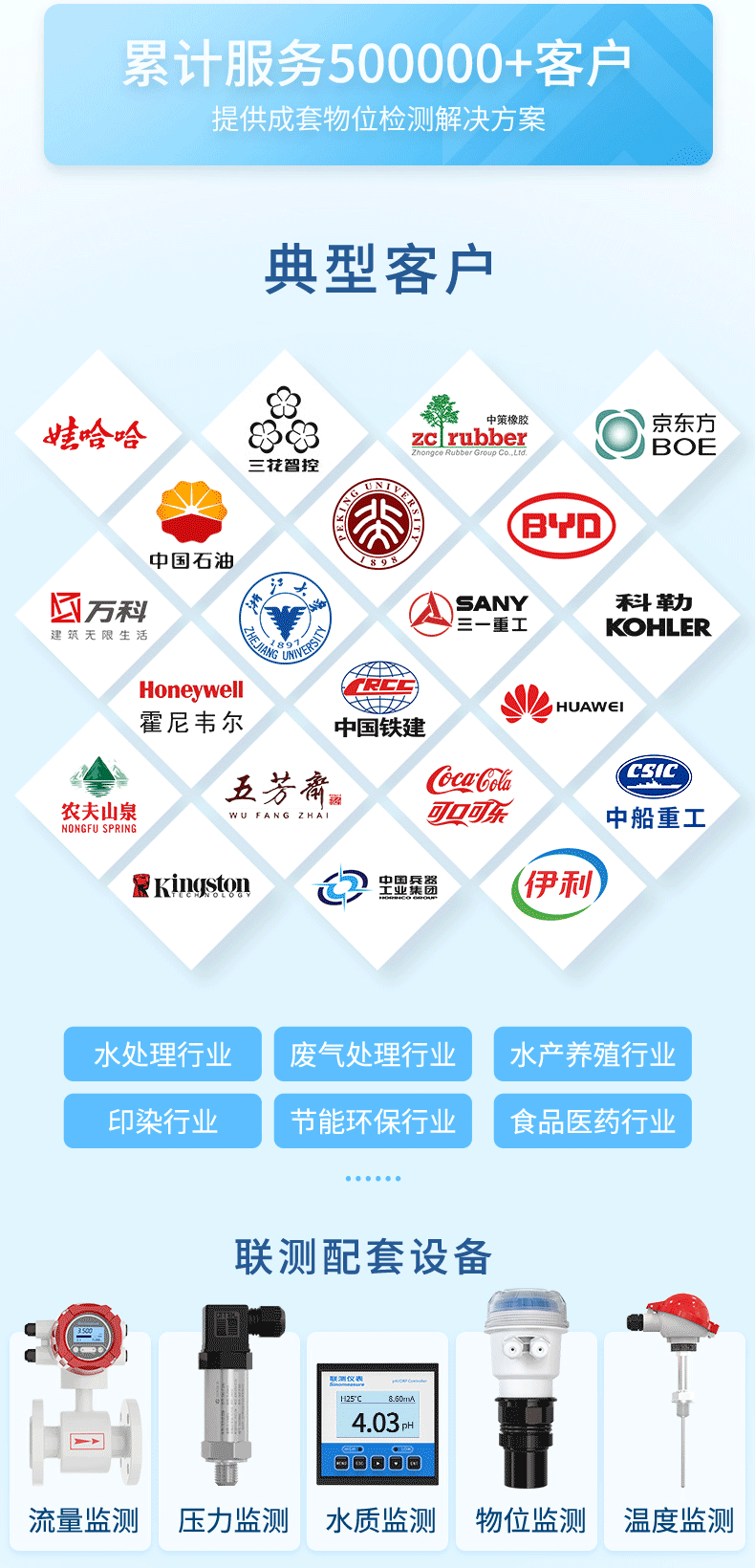 聯(lián)測儀表SIN-MP-C超聲波液位計(測量液位/物位),是一種非接觸式、高可靠性、高 性價比、易安裝維護的液位/物位測量儀器。它不需接觸被測量介質(zhì)就能 滿足大部分液位/物位測量要求,同時搭載我司自主研發(fā)無線模塊擁有超強信號覆蓋能力。